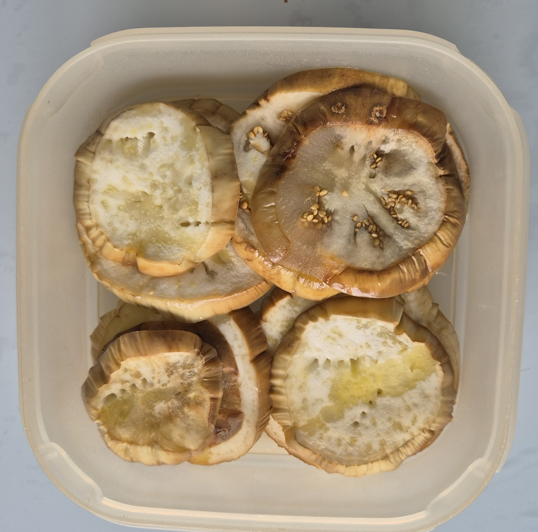 - Cortar la berenjena en rodajas no muy finas, de un centímetro o algo más, aproximadamente. Colocarlas en un recipiente de vidrio sin solaparse para agilizar la cocción y taparlo tras añadir un chorrito de aceite de oliva virgen extra o pulverizando con un spray.