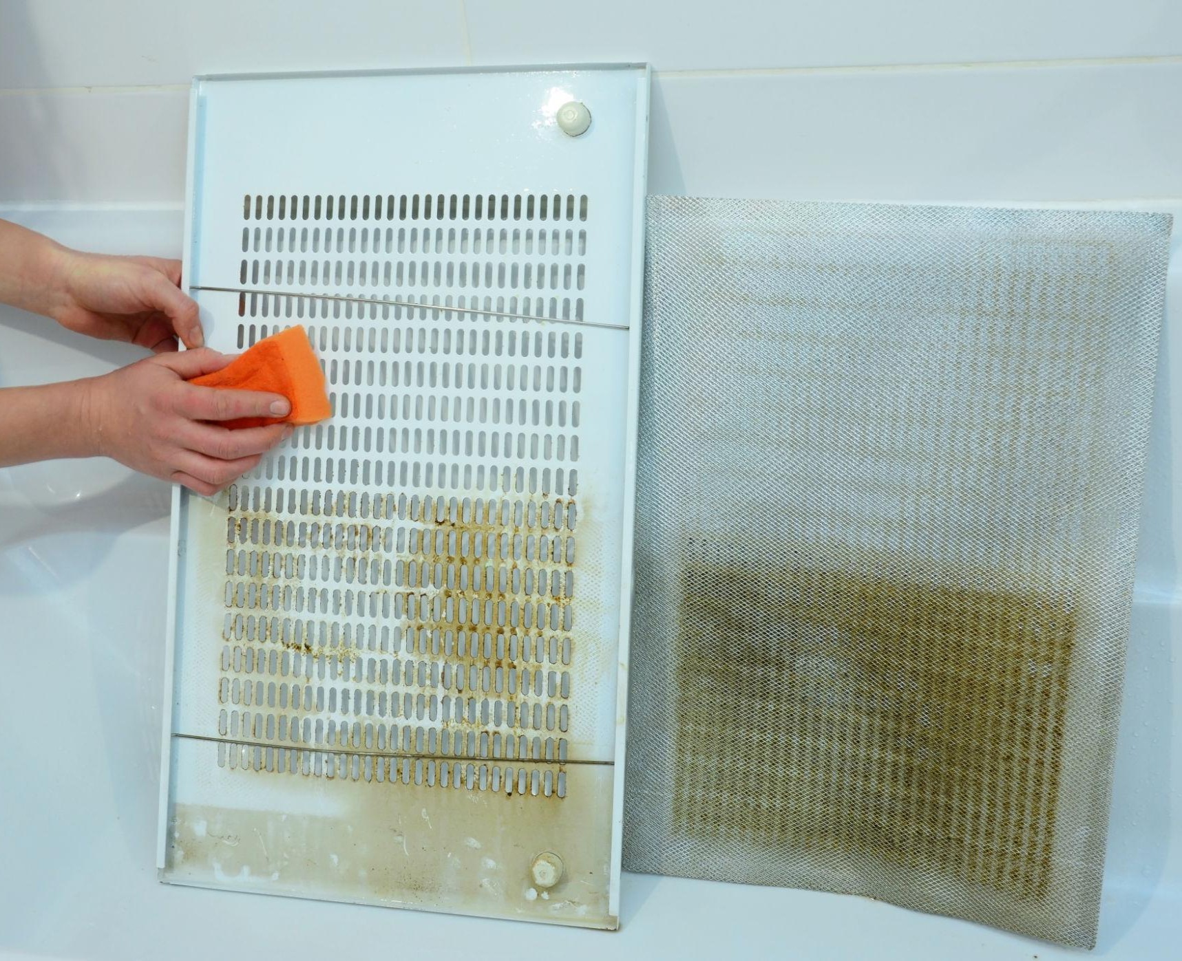 - Si no tenéis lavaplatos, tendréis que hacerlo a mano. Para ello, es imprescindible que empleéis agua muy caliente y un buen detergente por lo que utilizad guantes. Además, tendréis que facilitar la eliminación de la grasa frotando en la dirección del pulido del metal para que no deje residuos, con un estropajo o cepillo, en el filtro para arrastrar bien la grasa. Si está muy sucia, dejadla unos minutos sumergida en el agua caliente con el lavavajillas para que salga la grasa del interior de los filtros. Aclarad muy bien de nuevo con agua caliente y dejad secar.