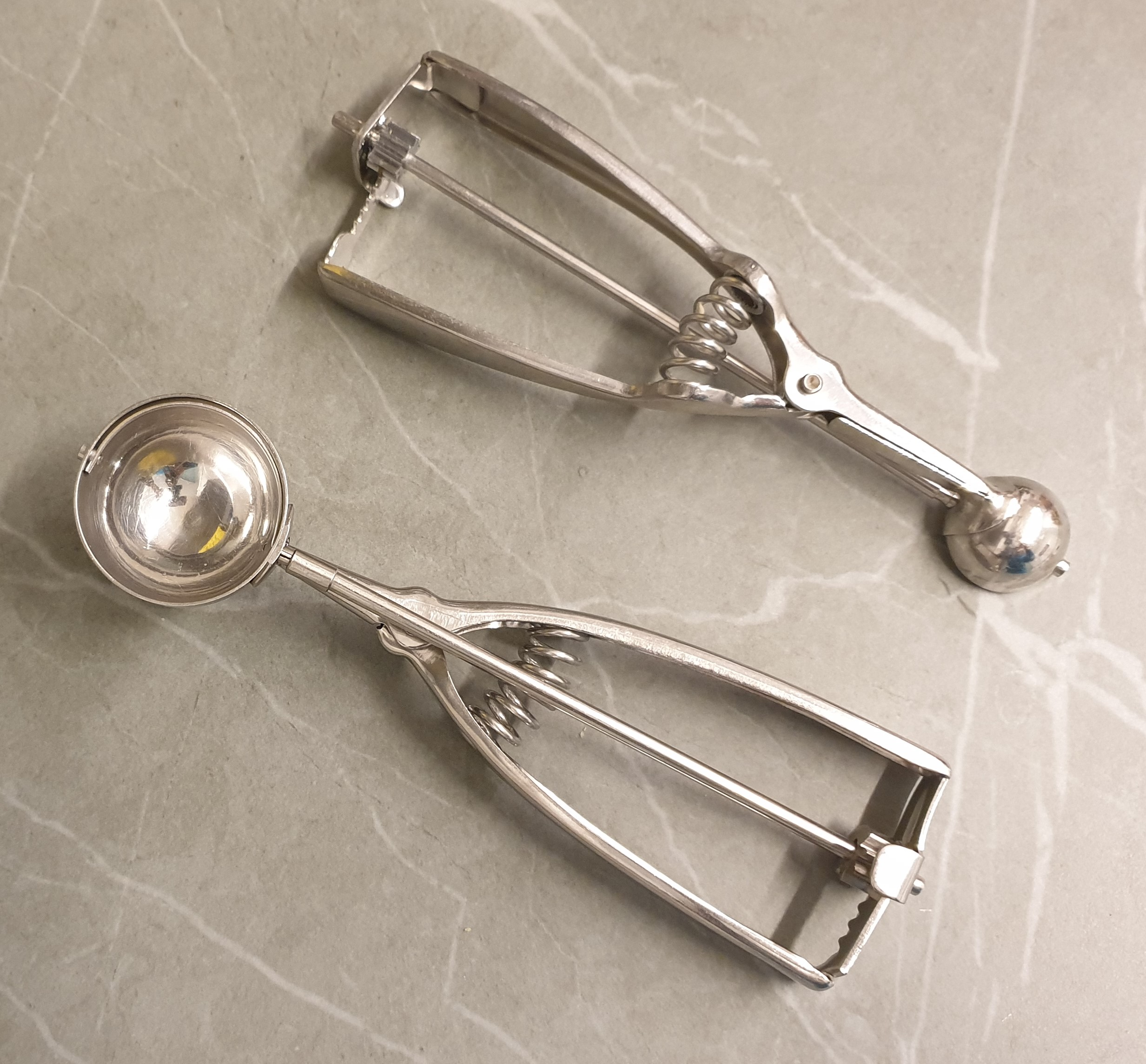 Se trata de un racionador de helados de acero inoxidable y tiene que llevar, como el que aparece en la foto, una especie de arandela también de acero que es la que expulsa la bola, sea de bechamel para las croquetas, sea de carne picada para las albóndigas, o de helados variados…